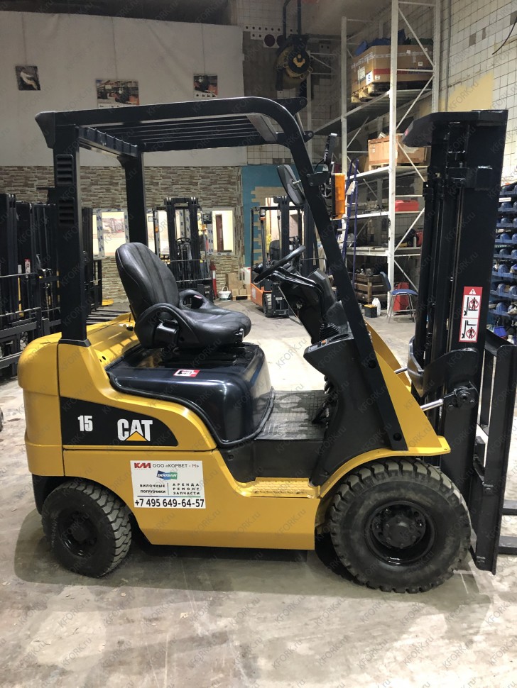 Дизельный автопогрузчик Caterpillar DP15NT с инвентарным номером КМ053 2012 года выпуска. Имеет грузоподъемность 1500 кг. Гарантия: 3 мес или 500 м/час.
